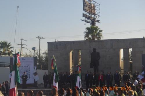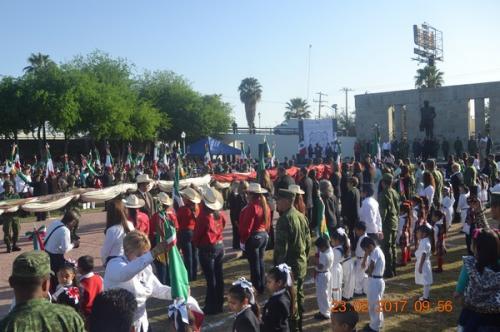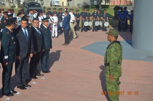 Nuevo Laredo, Tamaulipas.- En su segundo día de visita por Nuevo Laredo, el gobernador Francisco García Cabeza de Vaca participó en los honores a la monumental Bandera Nacional, que se ubica en el parque Morelos, adonde asistieron funcionarios estatales y municipales, así como mandos militares, alumnos y bandas de guerra escolares.