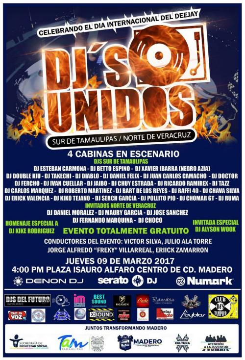 Madero, Tamaulipas.-El próximo jueves nueve de Marzo por la tarde, alrededor de 35 DJ’s del sur de Tamaulipas y del Norte de Veracruz, celebrarán el Día Internacional del DJ con una presentación en la zona centro de Madero.