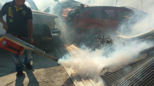 Matamoros, Tamaulipas.-Personal de COEPRIS se ha involucrado en las acciones de fumigación contra el Dengue, Zika y Chikungunya, que inició la III Jurisdicción Sanitaria en 42 yonkes que existen por la avenida del Niño y el Libramiento Emilio Portes Gil pero que el objetivo es abarcar todos estos negocios en Matamoros.