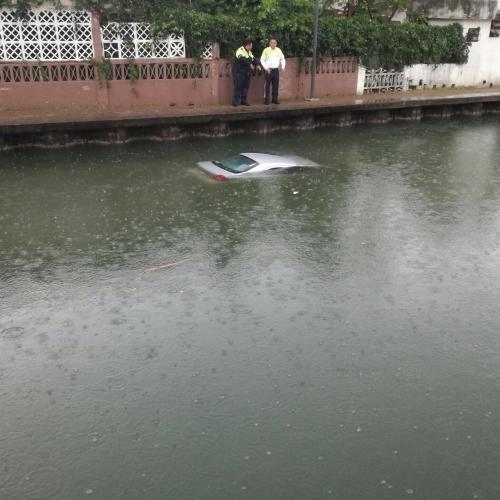 El reporte se registró a las 6:30 horas informando que un vehículo había caído a este cuerpo de agua al circular por la calle Isauro Alfaro en la zona centro de la ciudad.