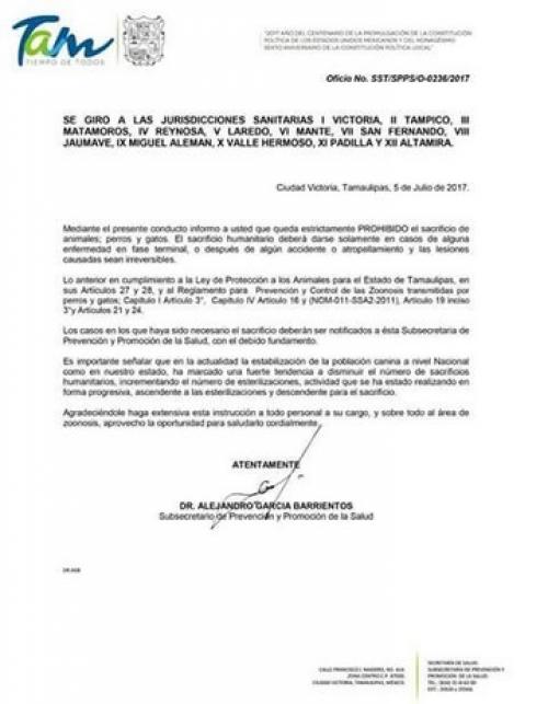 A través del Oficio Número SST/SPSS/0-236/2017 se notifica a las ocho jurisdicciones sanitarias en Tamaulipas el ordenamiento que prohíbe el sacrificio de mascotas (perros y gatos) con excepción de los casos extraordinarios antes referidos.