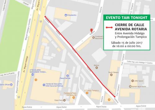 Tampico, Tamaulipas.-El Ayuntamiento de Tampico hace de conocimiento a la comunidad en general que con motivo del evento “Tam tonight”, será cerrada la avenida Rotaria entre avenida Hidalgo y prolongación Tampico del fraccionamiento Florida el día sábado 15 de julio del 2017 en un horario de 16:00 a 00:00 horas, recomendando a la ciudadanía optar por rutas alternas.