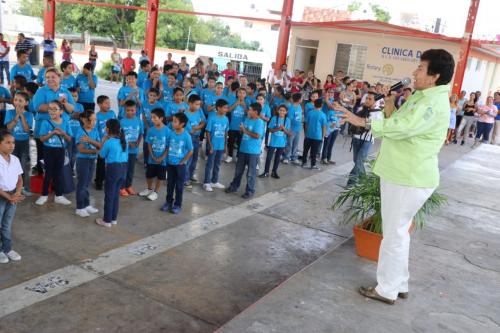 Se hizo entrega además del material didáctico que utilizarán los menores dentro de mencionado curso a los niños de esta escuela primaria de manos de la presidenta municipal.