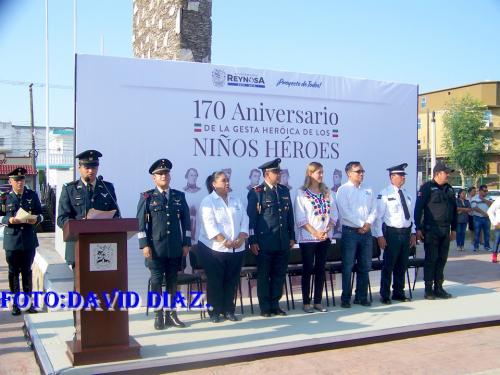 Reynosa, Tamaulipas.-Autoridades de los tres niveles de gobierno y alumnos de diversos planteles educativos encabezaron una ceremonia cívica para conmemorar 170 años de la gesta heroica de los Niños Héroes de Chapultepec, que se realizara en la plaza pública que lleva el mismo nombre, en la zona Centro.