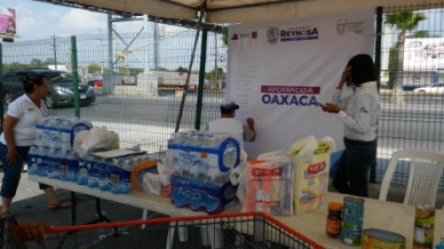 Reynosa, Tamaulipas.-El Ayuntamiento de Reynosa ha instalado 2 centros de acopio, en apoyo a nuestros hermanos del estado de Oaxaca que resultaron afectados por el terremoto del pasado 8 de septiembre. Los centros se encuentran instalados en las tiendas HEB del boulevard Hidalgo y en Soriana Morelos hasta el sábado 23 de septiembre.
