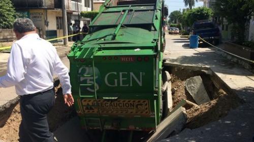 Un segundo hundimiento de se presentó por la tarde en la calle Niños Héroes entre Ramos Arizpe y Saltillo, de la colonia Felipe Carrillo Puerto, donde cayó un camión recolector de basura de una empresa privada.