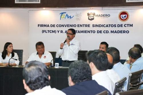 Madero, Tamaulipas.-El ayuntamiento y la Federación Local de Trabajadores de Ciudad Madero (CTM) conformaron un bloque en defensa de los intereses de la clase obrera organizada a través de la firma de un convenio de colaboración en el que se plantea la contratación de mano de obra y empresas locales para la realización de la obra municipal y privada.