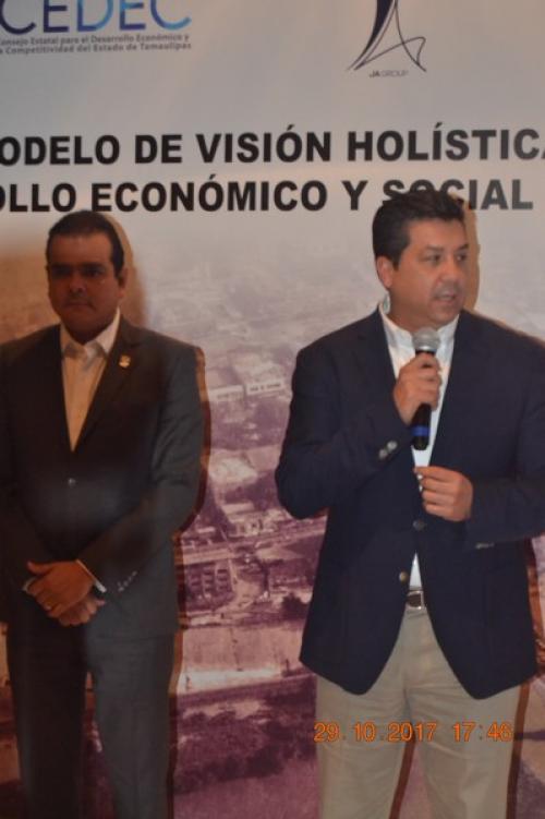 Nuevo Laredo, Tamaulipas.-Luego de reunirse con jóvenes, empresarios de ambos laredos y agrupaciones de la sociedad civil, el gobernador Francisco García Cabeza de Vaca, presentó a medios de comunicación el “Modelo Visión Holística” para Impulsar el Desarrollo Económico y Social de Nuevo Laredo, el que dijo, funcionará con la participación de los tres niveles de gobierno en unión con la sociedad civil y los empresarios.
