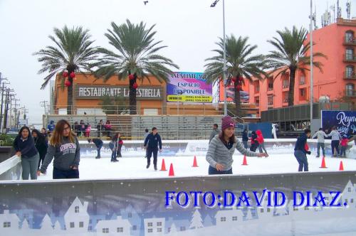 Reynosa, Tamaulipas.-Cientos de ciudadanos siguen acudiendo a la pista de hielo gestionada por las autoridades municipales, donde a diario se puede apreciar jóvenes y niños que son los que más se divierten no importando las bajas temperaturas que se registran.