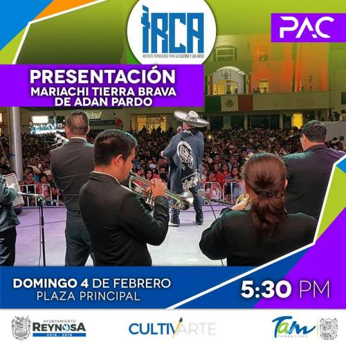 A las 5:30 de la tarde llega al escenario, que el Gobierno de la doctora Maki Ortiz y el Instituto Reynosense para la Cultura y las Artes prepararon en la explanada de la plaza Miguel Hidalgo, el cantante de míºsica vernácula Adán Pardo con su sonora voz, que al ritmo de las cuerdas y trompetas de Tierra Brava ofrecerá su amplio repertorio.