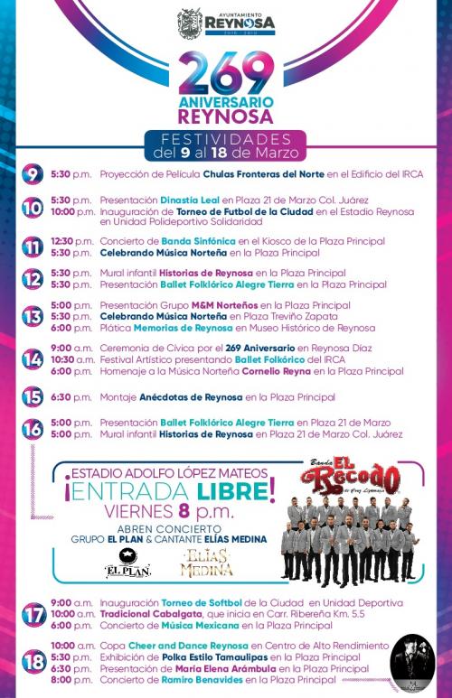 Artistas del IRCA, deportistas reynosenses y también la actuación de la Banda El Recodo y un homenaje al cantante Cornelio Reyna, forman parte de los festejos del 269 Aniversario de la Fundación de Reynosa, que dentro de su festividad tendrá una ceremonia cívica el día 14 en Reynosa Díaz como un homenaje a los fundadores y a los reynosenses que hoy hacen de esta tierra la ciudad más progresista de Tamaulipas.