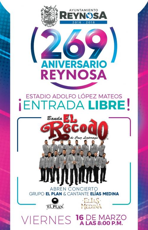 Artistas del IRCA, deportistas reynosenses y también la actuación de la Banda El Recodo y un homenaje al cantante Cornelio Reyna, forman parte de los festejos del 269 Aniversario de la Fundación de Reynosa, que dentro de su festividad tendrá una ceremonia cívica el día 14 en Reynosa Díaz como un homenaje a los fundadores y a los reynosenses que hoy hacen de esta tierra la ciudad más progresista de Tamaulipas.