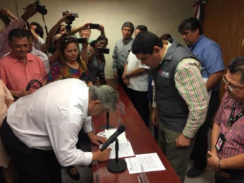 En punto de las 17:00 horas ante el Consejero Presidente del Instituto Nacional Electoral Distrito 08, Juan José Ramos Charre se presentó el aspirante a este puesto de elección popular e hizo la solicitud correspondiente a esta autoridad.