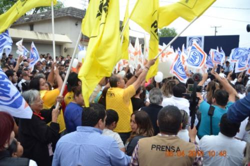 Subió a un improvisado templete acompañado de su esposa, la presidenta del Sistema DIF, Adriana Herrera Zárate; su suplente a la alcaldía, Arturo Sanmiguel Cantíº; del candidato a senador, Ismael García Cabeza de Vaca, del candidato a Diputado federal por este distrito, Salvador Rosas Quintanilla.