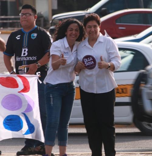 Olga cerró con una entusiasta brigada de bandereo en la avenida Hidalgo y Marqués de Guadalupe, sector El Charro, consolidando la presencia de los partidos que la apoyan Morena, PES y PT.