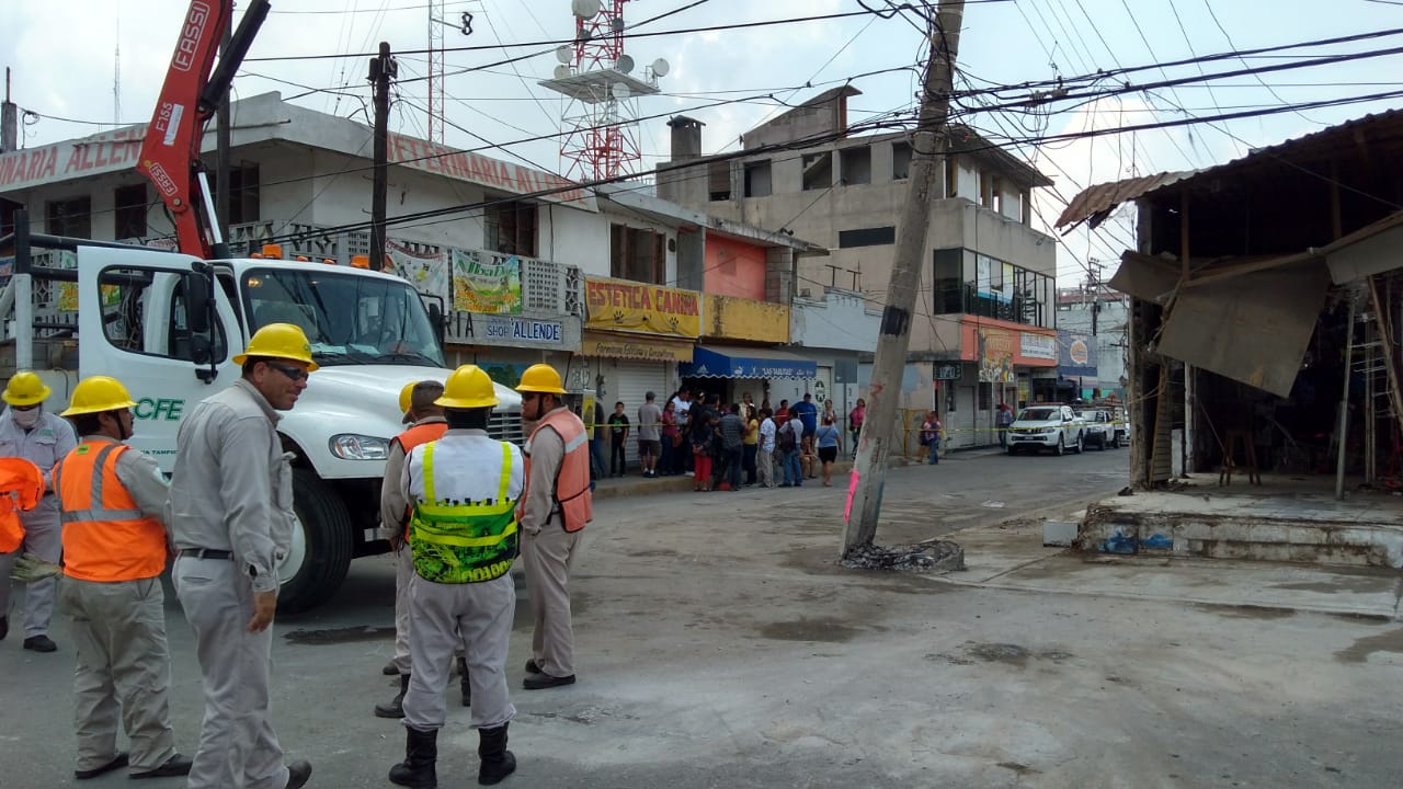 Desde altas horas de la noche hubo presencia del perosnal de la CFE debido a que la unidad que colisionó el negocio de la esquina dejo destruida la base del poste de luz, se espera que en el transcurso de las próximas horas quedé suspendido el suministro de energía eléctrica en la zona centro de Altamira para efectuar la sustitución de esta infraestructura.