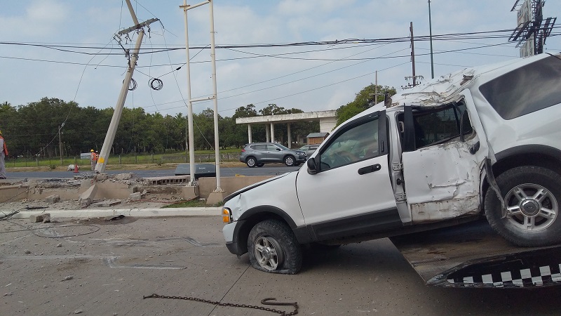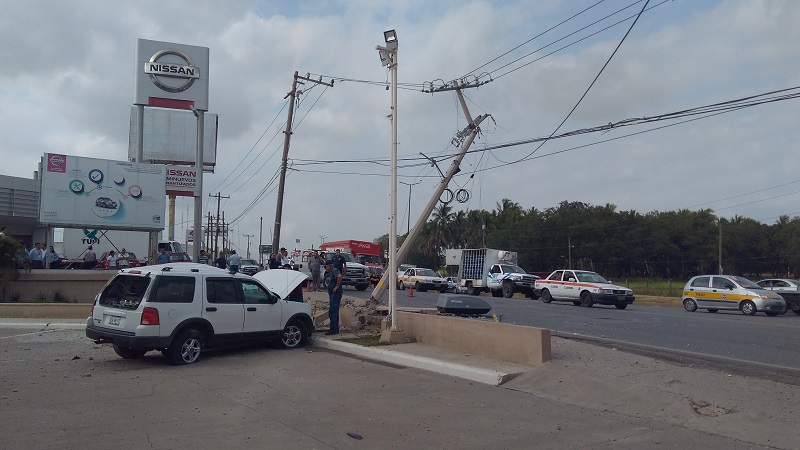 Una Ford Explorer con placas de Tamaulipas chocó contra un poste de luz de la CFE que está a punto de caer sobre el carril lateral.