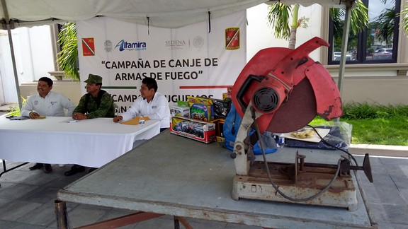 Erik Guzmán Canales teniente del ejército mexicano señala que las personas que llegan con armas o municiones no se les cuestionan en lo absoluto su procedencia o como fue adquirida, íºnicamente se procede a recibirla y dependiendo del calibre se efectíºa el canje en vales de despensa o juguetes.