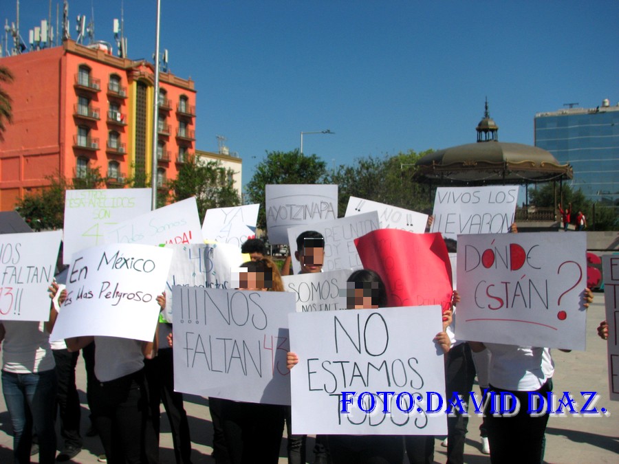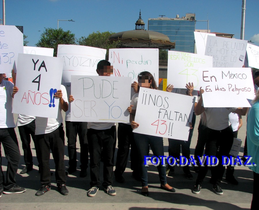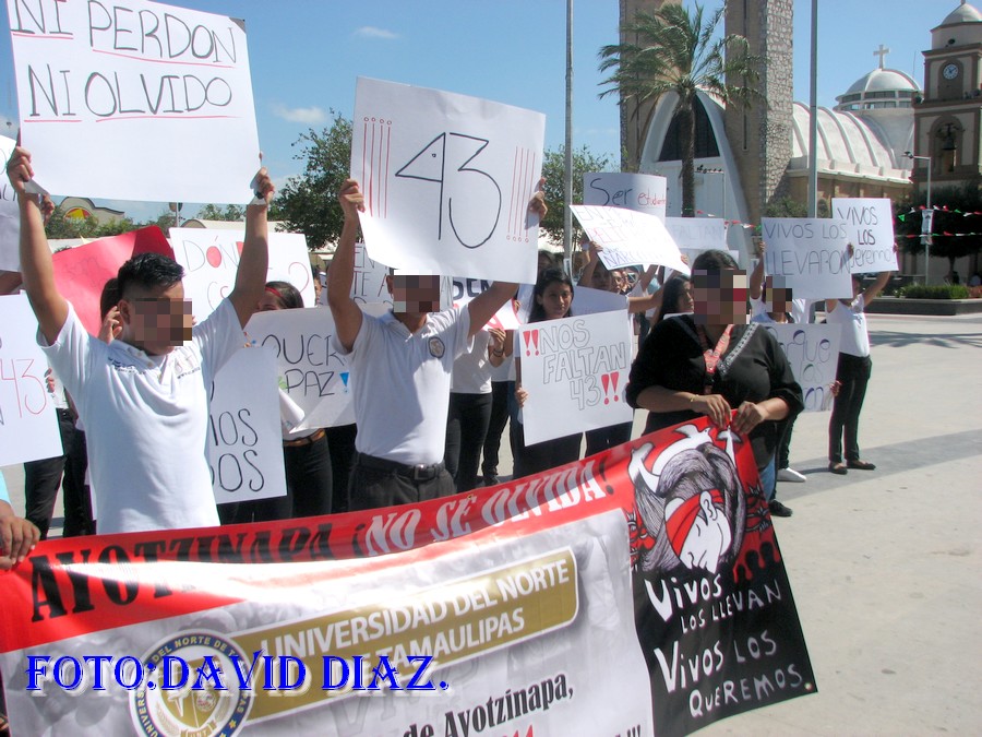 Reynosa, Tamaulipas.-Un grupo de estudiantes caminaron por las calles de la ciudad hasta la plaza principal de Reynosa con la finalidad de recordar el cuarto aniversario de la desaparición de los 43 normalistas de Ayotzinapan.