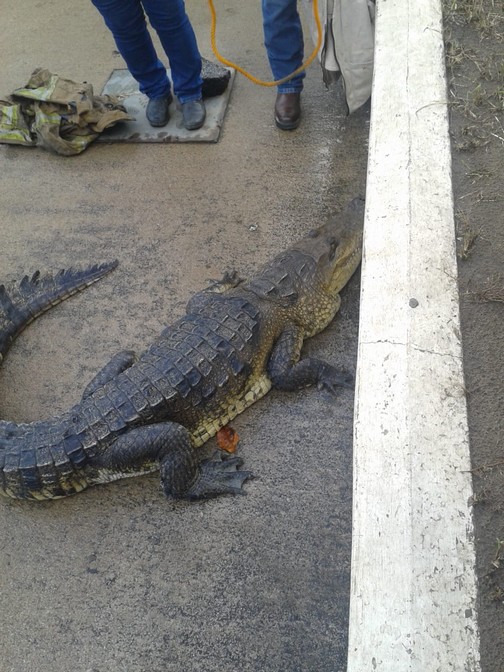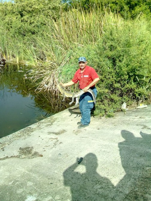 Otro saurio más de 2 metros y medio fue capturado esta mañana de martes mientras se desplazaba sobre la avenida de la Industria en inmediaciones de la empresa NHumo y otro más de dos metros durante la semana pasada en la empresa Biofilm.