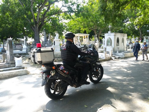 Tampico, Tamaulipas.-Para garantizar la seguridad de la gente que acude a viistar durante este día y mañana el Cementerio Municipal los elementos de la Policía Estatal Acreditable Grupo “Lince”, hacen rondines de vigilancia por este lugar, incluso este medio día hicieron la detención de individuos que estaban ingiriendo alcohol en ese sitio, informó la Directora de Cementerios Lizbet García Aldape.