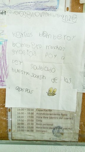 Para reconocer el valor y trabajo que diariamente desempeñan los elementos del cuartel de bomberos, varios alumnos del jardí­n de niños Rodolfo Torre de la colonia Presidentes de Altamira hicieron la entrega de dibujos y acuarelas, mismos que fueron colocados en el cuartel.
