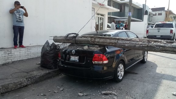 Madero, Tamaulipas.-Un poste en malas condiciones de la Comisión Federal de Electricidad, cayó sobre un vehículo estacionado en la colonia primero de mayo de Madero, sin que se reporten personas lesionadas.
