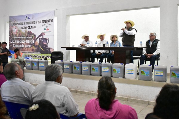 El Mante, Tamaulipas.-El Gobierno del Estado llevó a cabo la primera entrega de 54 mil litros de biofertilizante a mil 200 productores de la región de El Mante quienes lo aplicarán en una extensión de 11 mil hectáreas de riego con el objetivo de fortalecer al cultivo de caña de azíºcar y con ello incrementar su producción para seguir abasteciendo el ingenio azucarero.