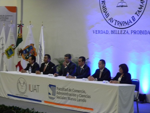 œDe que la comunidad estudiantil y docente de esta Facultad de Comercio, Administración y Ciencias Sociales de Reynosa¦perdón¦Nuevo Laredo¦me resbalé¦ (risas y comentarios de los asistentes). Al pasar por ese momento continuó con su discurso relacionado con el proceso de nombramiento del nuevo director de la Facultad.