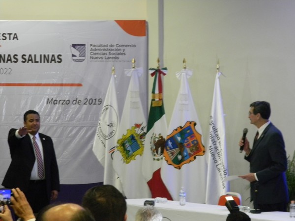 Nuevo Laredo, Tamaulipas.-El rector de la Universidad Autónoma de Tamaulipas, José Andrés Suárez Fernández, le tomó la protesta como nuevo director de la Facultad de Comercio y Administración, a quien dirigirá por cuatro años (2019-2022) esta Casa de Estudios en Nuevo Laredo, René Adrián Salinas Salinas, en sustitución de Luis Hernán Lope Díaz, quien deja el cargo a una nueva administración.