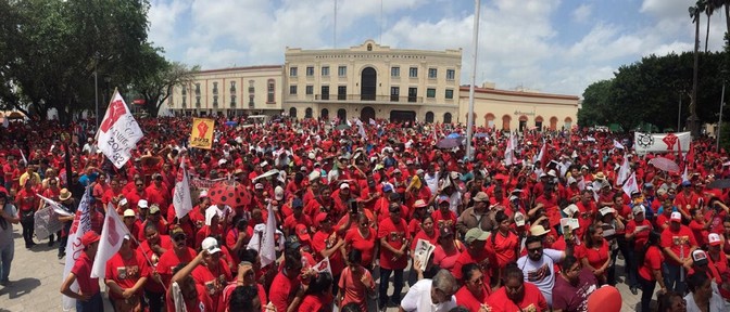 Durante el largo trayecto se pudo observar a la gran cantidad de obreros, todos portando blusas y camisetas de color rojo, lo que llamó la atención de la gente en Matamoros.