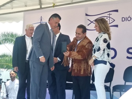 Enseguida el funcionario Estatal hizo entrega de un regalo al obispo electo a nombre del gobierno del estado, consistente en una cuera tamaulipeca, siendo ovacionado por los feligreses, quienes también entonaron dos canciones.