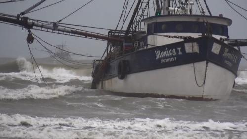 Matamoros, Tamaulipas.-Encalla barco camaronero “Mónica I” en playa de Matamoros.