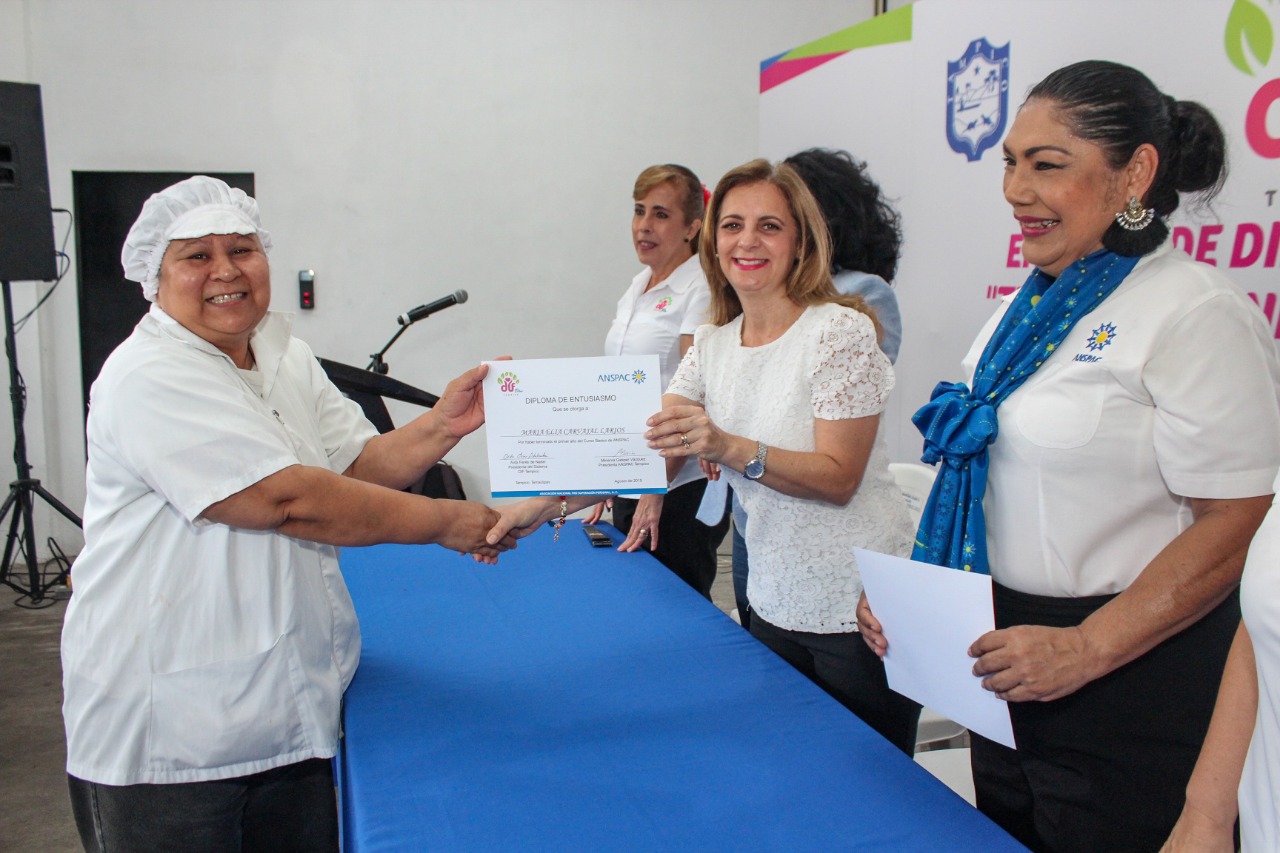 La Presidenta del Sistema para el Desarrollo Integral de la Familia, Aida Feres de Nader, agradeció el apoyo de la empresaria, Trinidad Maximoto para que sus colaboradoras reciban este curso en horario de trabajo y que además en breve continuarán con el segundo módulo.