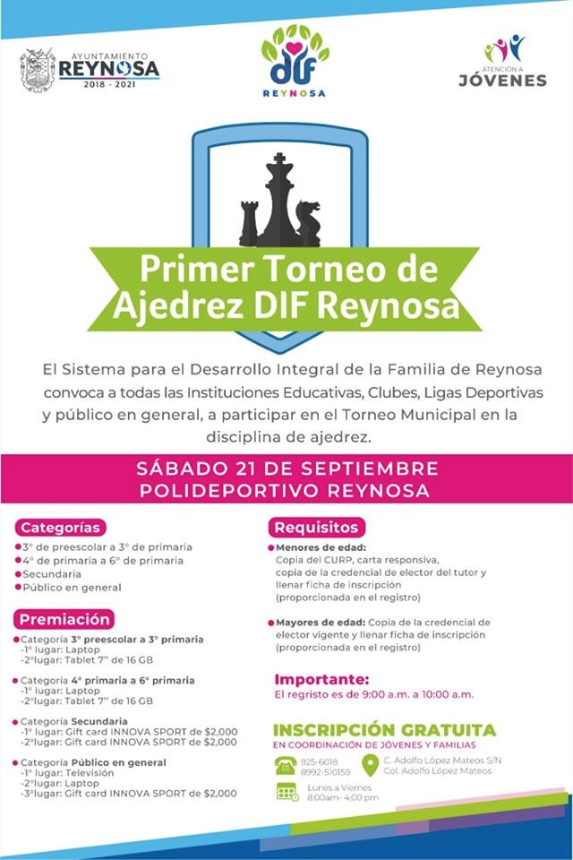REYNOSA, TAM.-El Sistema DIF Reynosa que encabeza Carlos Peña Garza, a través del programa Jóvenes y Familias, invita a la población escolar y al píºblico en general para que participen en el Primer Torneo de Ajedrez DIF Reynosa.