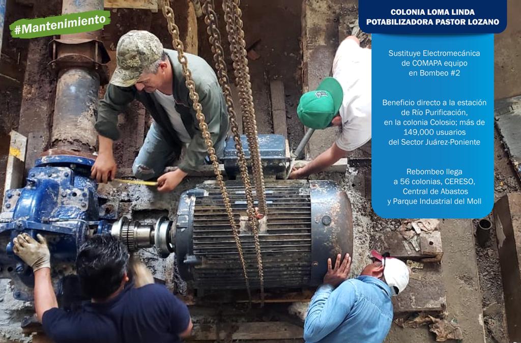REYNOSA, TAM.-Con el reemplazo de un equipo de bombeo en la potabilizadora Pastor Lozano, la COMAPA de Reynosa fortalece el rebombeo hacia la estación Río Purificación que abastece a 56 colonias, así como a tres sectores del orden píºblico y privado en Juárez-Poniente.