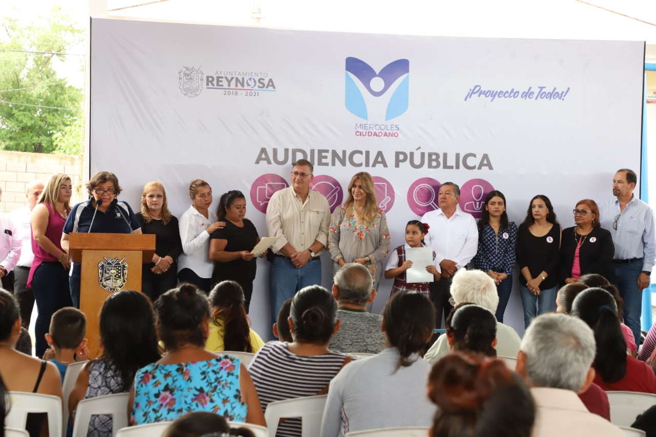 œTenemos tantas obras como nunca en Reynosa, hemos hecho parques, llevamos hechas casi 500 pavimentaciones, el año pasado rehabilitamos 120 escuelas, 9 parques, el Programa de Becas más grande en la historia, con 100 Millones de Pesos, aseguró la Alcaldesa, quien invitó a los asistentes a la Audiencia Píºblica, a ser más constantes en sus pagos de agua y Predial.
