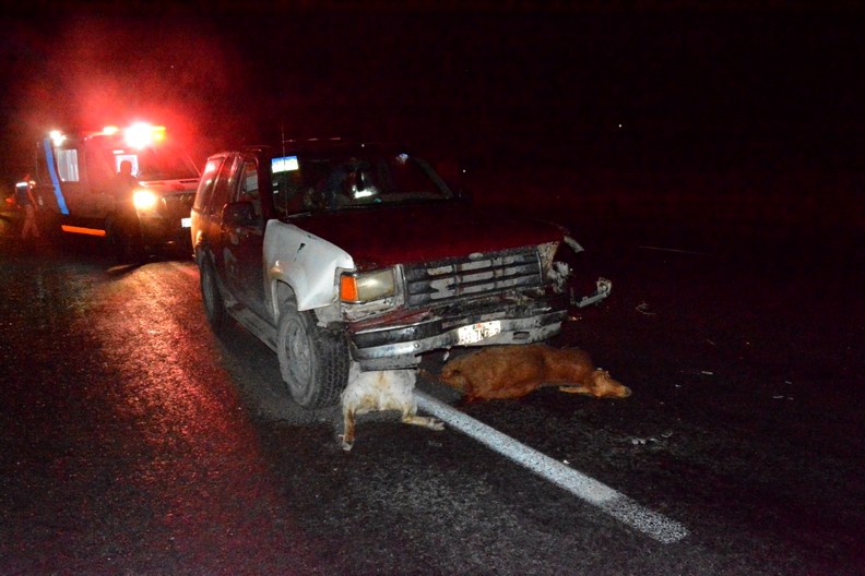 En el lugar se encontraba una camioneta tipo Ford, color guinda, modelo aproximado 2000, con placas del estado de Texas que se impactara contra unas chivas que iban cruzando la concurrida vialidad y que por lo menos dos de ellas resultaran sin vida, mientras que tres más con lesiones y una más que logro pasar