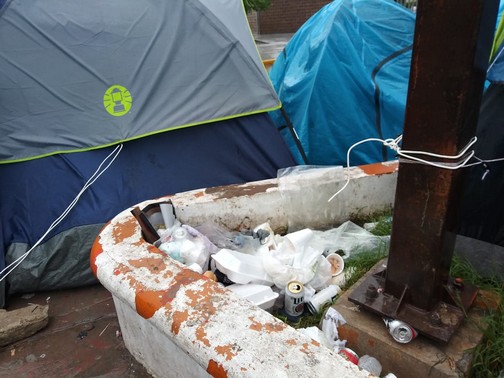 Matamoros, Tamaulipas.-Latas de cerveza tiradas entre platos de comidas se pudieron observar en el campamento de migrantes dentro del Puente Nuevo Internacional de Matamoros.