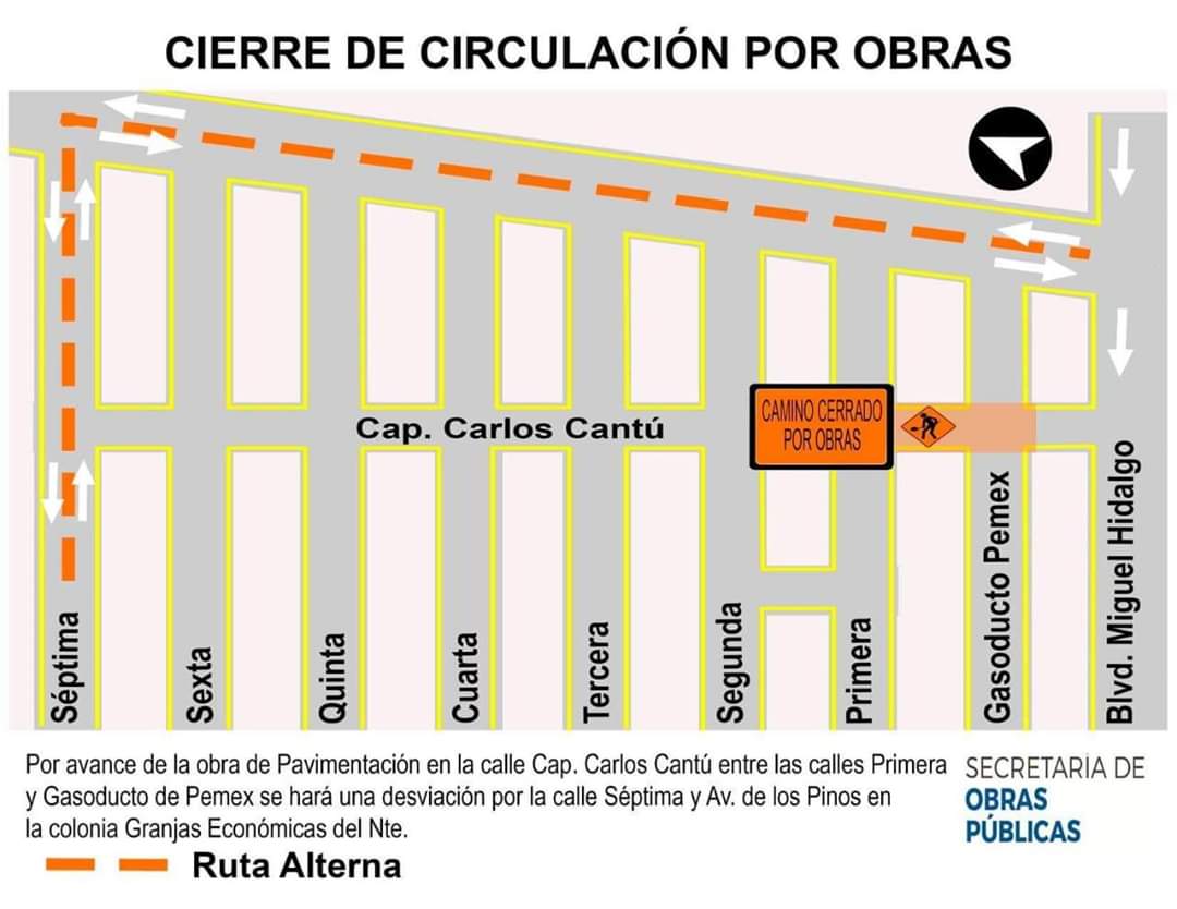 REYNOSA, TAM.-Por avance de la obra pavimentación, que realiza la Secretarí­a de Obras Píºblicas, Desarrollo Urbano y Medio Ambiente del Gobierno Municipal de Reynosa, en la calle Capitán Carlos Cantíº, entre Calle Primera y Gasoducto Pemex, se habilitó una desviación por la Calle Séptima en la colonia Granjas Económicas del Norte. Favor de tomar rutas alternas como lo indica la imagen, y promover el cuidado de las obras que benefician a la comunidad.