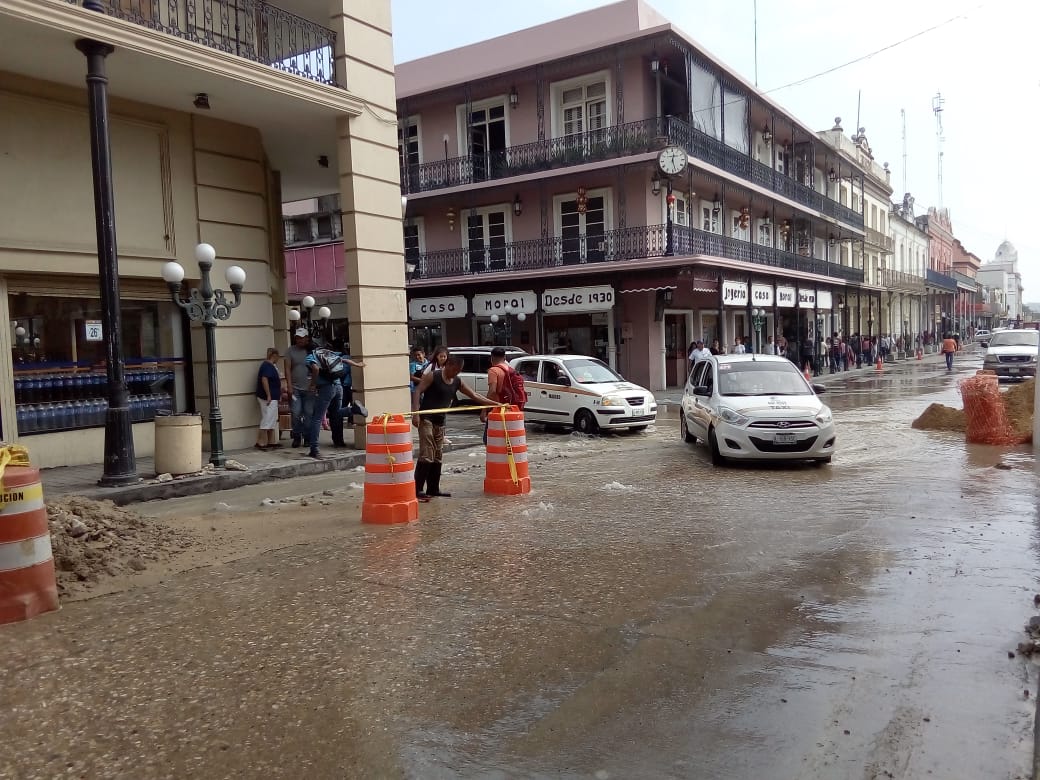 El vital líquido fluía de la obra ubicada en la esquina que forman las calles Francisco I. Madero y Benito Juárez en el centro de la ciudad, y el agua corría de manera impresionante esparciéndose de inmediato sobre la calle Francisco I Madero, que impedía a los transeíºntes cruzar la arteria.