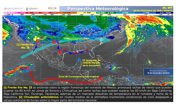 El frente frío ingresará a esta frontera en conjunto con una masa de aire polar que ocasionará un marcado descenso de temperatura, para el amanecer la mañana del martes 17 con una mínima entre los 8 y 9 Centígrados y se mantendrá como estacionario por varios días.