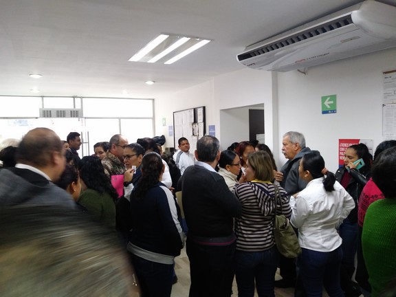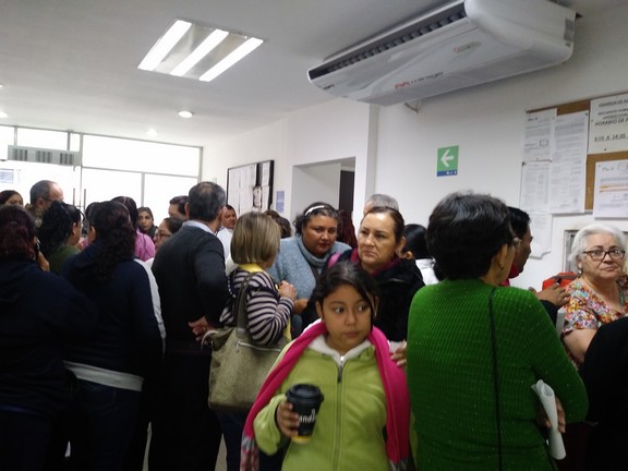 Tampico, Tamaulipas.-Trabajadores de la Jurisdicción Sanitaria No. II, que comprende Tampico y Ciudad Madero, estuvieron formados desde muy temprano hasta esta tarde, porque hoy les darían el pago del aguinaldo, prima vacacional y bono anual a los 916 que conforman la plantilla laboral, pero no se les pagó.