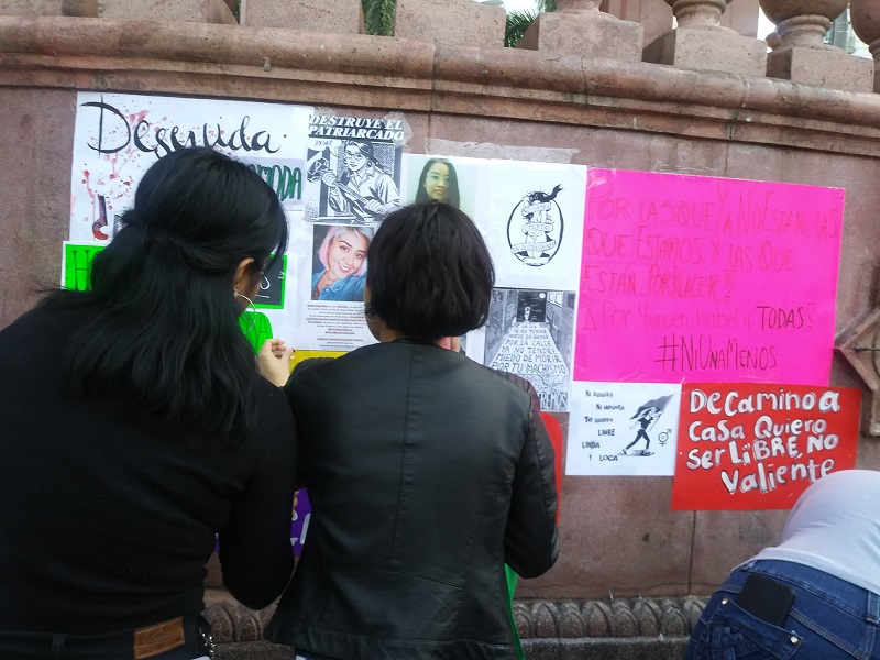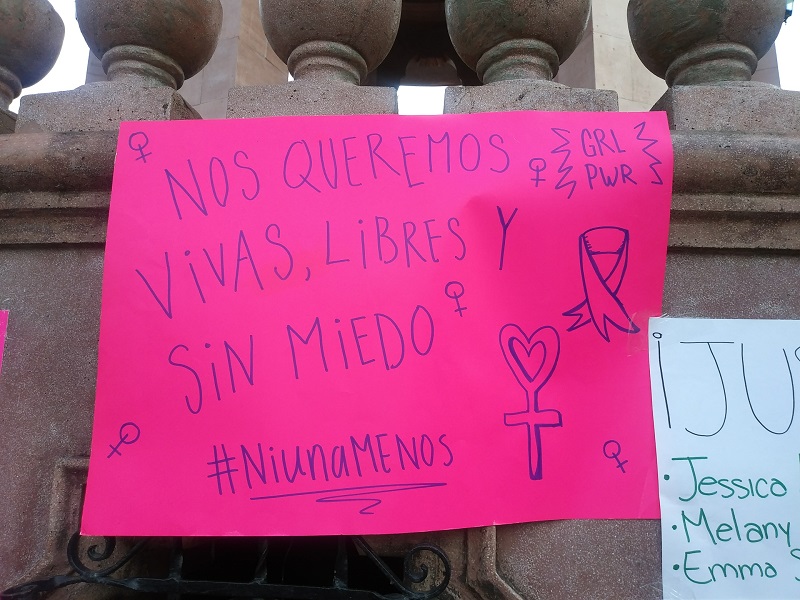 Tampico, Tamaulipas..-“Ni una más”, “De camimo a casa quiero ser libre no valiente”, “Ni sumisas, ni devotas, libres, lindas y vivas”, se leía esta tarde en las pancartas que usaron para manifestarse integrantes del colectivo Aquelarre para visibilizar los feminicidios y exigir que acabe la violencia encontra de las mujeres.