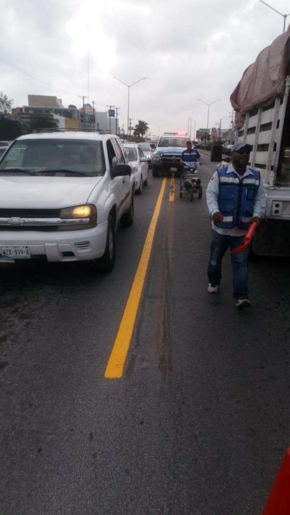 Los trabajadores municipales efectuaron este jueves 13 de febrero, su labor de pintura en las lí­neas centrales, color amarillo, del bulevar Morelos, desde la calle Praxedis Balboa, hasta la avenida Tiburcio Garza Zamora.