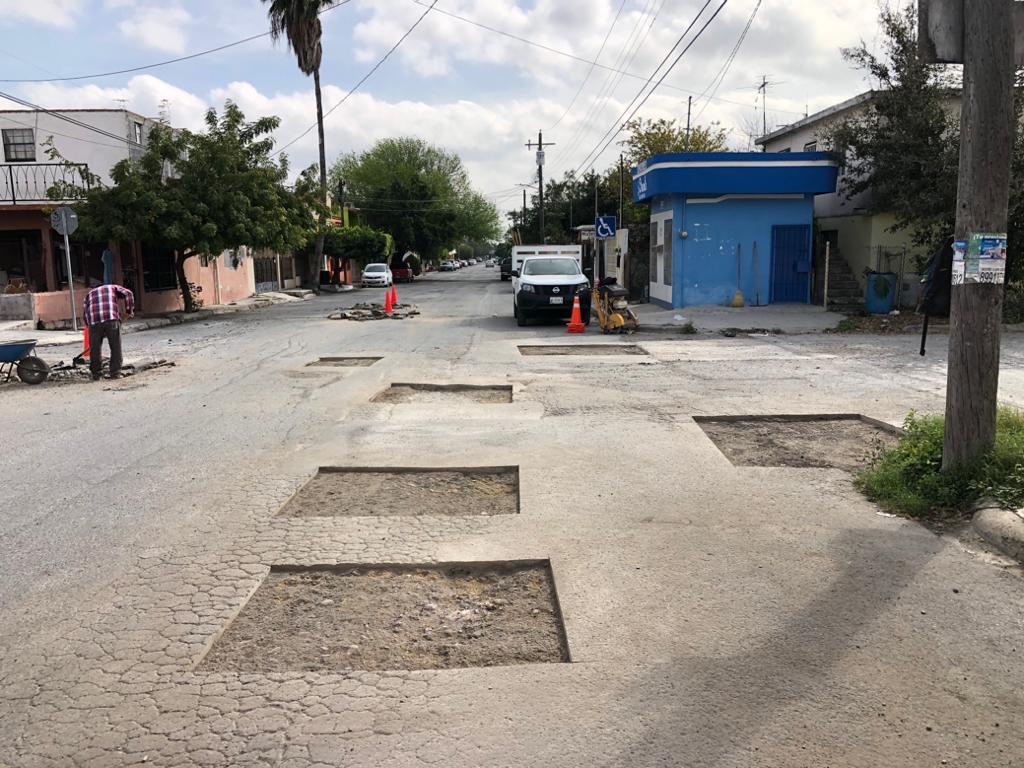 Las cuadrillas municipales reparan la calle Puerto México, de la colonia Ampliación Rodríguez, donde excavan un cajón de bacheo para que el relleno deje la capa uniforme, con asfalto caliente, lo que le da solidez al tramo en rehabilitación y garantice la durabilidad de la reparación.