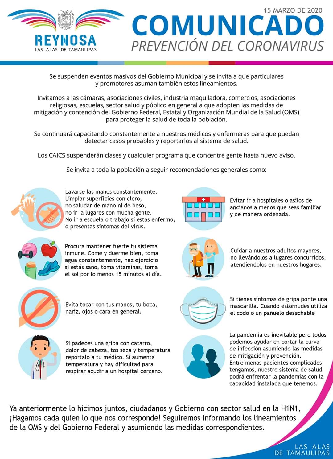 REYNOSA, TAM.-El Gobierno Municipal convoca a la población en general a seguir practicando las medidas de prevención para la contención y mitigación del Coronavirus iniciando con la permanencia dentro del hogar y salir sólo en caso necesario, manteniendo la distancia física con otras personas.