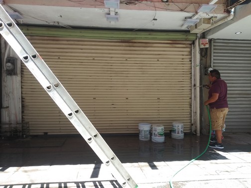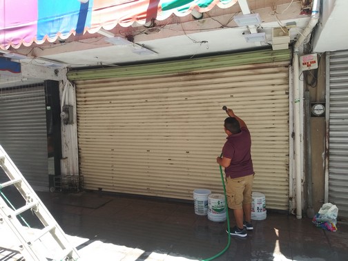 Matamoros, Tamaulipas.- Locatarios de la calle Peatonal tras recibir el exhorto que les entregó Coepris el pasado 30 de abril, de mantener cerrados sus negocios, han decidido aplicar remodelaciones o incluso lavar las fachadas y cortinas metálicas de dichos inmuebles.