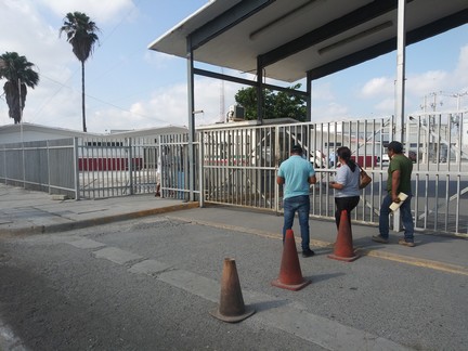 Matamoros, Tamaulipas.- Personal de la Oficina del Servicio de Administración Tributaria se negabn atender a contribuyentes que no tuvieran cita para este lunes, teniéndolos por más de una hora afuera de las instalaciones en la calle, en donde estaban expuestos al sol y al polvo que levantaban las maquinarias pesadas al estar efectuando trabajos de recarpeteo de la avenida.