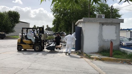 El traslado de los cuerpos se hizo mediante una carroza que los paso del cuarto improvisado al contenedor, posteriormente fueron introducidos con un montacargas que hizo el acomodo de los cuerpos en unas tarimas.